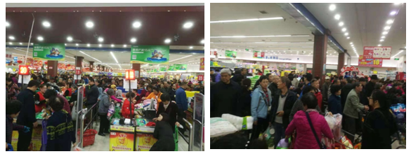公司后勤人員聯動,補充收銀,收檢孤兒商品,更換銀臺人員就餐;賣場前勤人員,全線熱力補貨,后勤人員輪流。